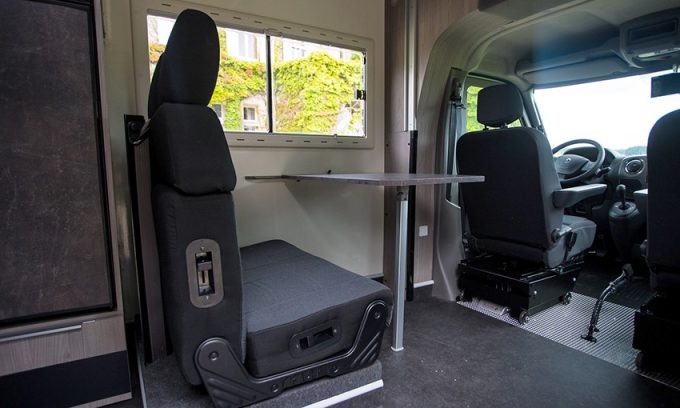 Selon les besoins du futur utilisateur, un fauteuil roulant peut être positionné sur une embase de fixation automatique au niveau du poste de conduite. Un système qui permettra de s’installer au poste passager ou au poste conducteur sans réaliser de transfert. Sur les sièges d’origine, peut être installée une embase à roulette afin de faciliter leurs déplacements.