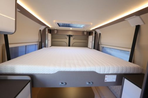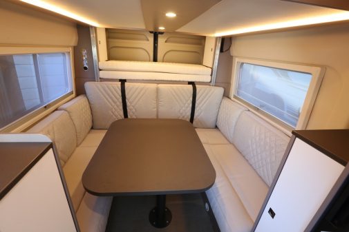 En revanche, la partie arrière s'affiche très nettement comme le poste majeur. La dînette se compose de banquettes en U avec une table centrale. Au-dessus de nos têtes, le lit de pavillon s'abaisse à la nuit tombée pour offrir un vaste couchage double de 140 x 200 cm. Il profite d'un système manuel pour abaisser ou relever l'ensemble. Le salon est également convertible dans le cas d'un usage à 4. Si ce véhicule profite de base de la motorisation de 140 ch, Bürstner est resté totalement muet quant à un quelconque tarif.