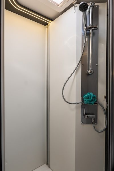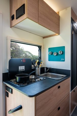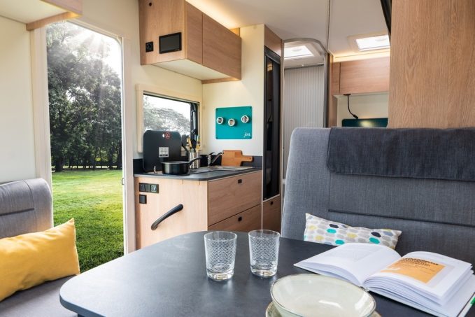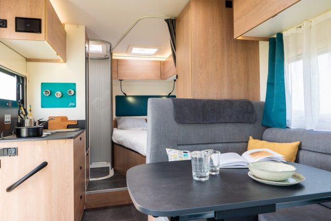 Joa Camp se distingue de la concurrence en optant pour une salle d'eau Vario avec une paroi pivotante permettant de passer d'un compartiment toilette et WC à une douche isolée. A noter la large ouverture de cet espace optimisé grâce à un rideau coulissant. La cuisine reste fidèle à l'esprit Joa Camp avec un bon équipement sur ce modèle. En effet, elle dispose d'un réchaud 2 feux, de trois grands tiroirs et surtout d'un grand frigo de 138 l.