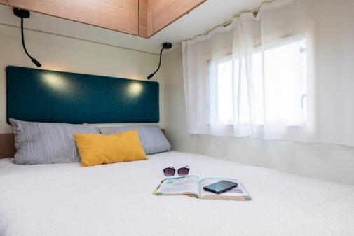 A son bord pour autant, la jeune marque nantaise a décidé de miser sur un lit à la française en partie arrière. Comprenez par cette appellation que le couchage est logé dans le sens de la longueur. il profite de dimensions de 140 x 200 cm. Enfin 140 cm aux épaules puisqu'un biseau a été réalisé sur le matelas, au pied, pour faciliter la circulation vers la salle d'eau. Avec ce type d'agencement, il est en effet coutume de retrouver le cabinet de toilette attenant à la chambre et présentant, là aussi, un espace étudié dans la longueur.