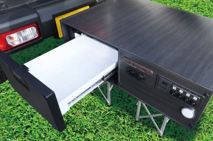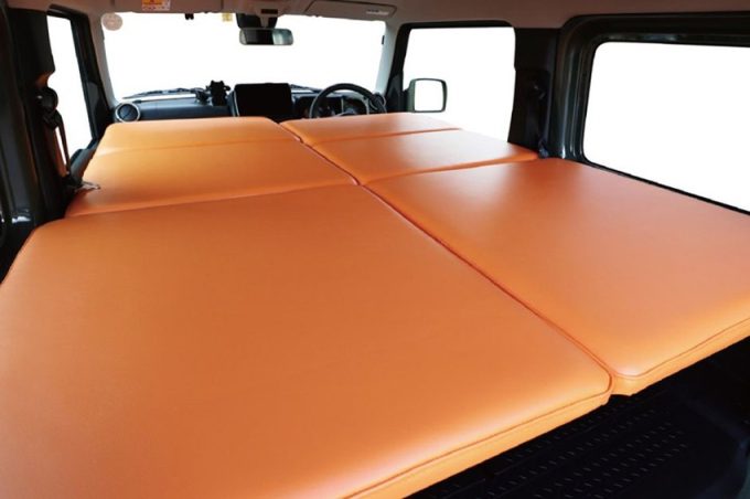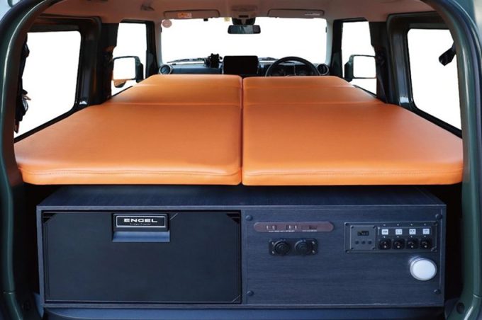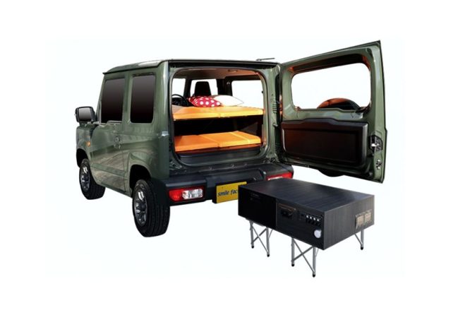L'entreprise nippone Smile Factory propose un kit pour le Suzuki Jimny qui comprend un couchage, un mini-réfrigérateur et une batterie auxiliaire afin de transformer le petit tout-terrain en camping-car de poche pour des virées en off-road.