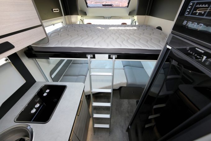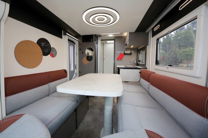 Dans notre dossier, le X150 aurait pu figurer sous la thématique “ultra-compacité” avec son gabarit de fourgon ou celle des profilés “sans lit au plancher”. Leur association et le caractère unique de ce camping-car l’ont fait basculer dans cette catégorie, celle des “originaux”. Dès sa sortie, au printemps 2021, ce véhicule bridé sur Fiat Ducato a séduit la rédaction. Le X150 est bardé d’atouts, à commencer par sa discrétion et son hybridation, à mi-chemin entre profilés et fourgons. Ce Challenger a donc toutes les qualités requises pour répondre à une large demande. En se passant de lit permanent au plancher, il propose une habitabilité record. Le salon est donc très spacieux, constitué de vastes banquettes latérales en vis-à-vis. Il est surmonté d’un lit de pavillon électrique de 140 x 190 cm. L’espace octroyé à la salle d’eau la rend agréable. En occupant toute la largeur arrière de la cellule, on y trouve un vaste cabinet de toilette et une ample cabine de douche… Le réservoir d’eau propre est taré à 1 l pour gagner de la charge utile à l’homologation. Une astuce inutile à notre sens puisque le poids à vide en ordre de marche laisse suffisamment de marge pour prendre la route avec le réservoir rempli de ses 100 l d’eau.