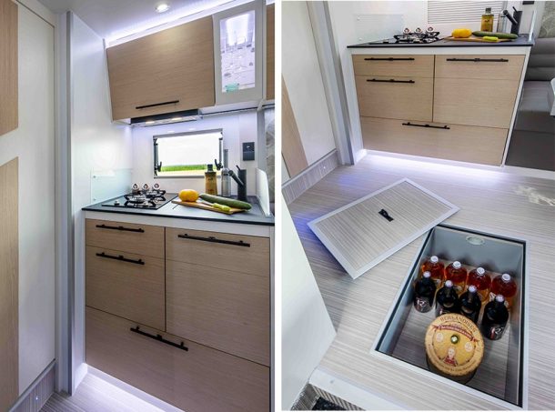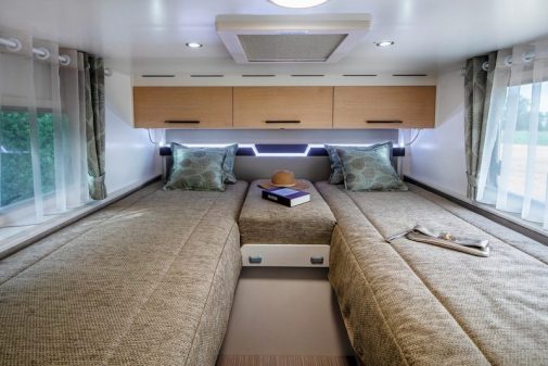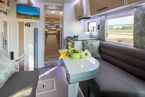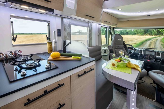 La qualité d’assemblage, la présentation, le choix des matériaux, restent toujours le point fort de la marque – qui célèbrera pour de bon son centenaire au mois de juin. Cela se vérifie pour tous les postes de vie comme le coin cuisine (plan de travail en Polyrey), la salle d’eau (receveur de douche XL, portes repliables). Le salon reçoit une sellerie d’excellente facture, une table repliable en portefeuille, un lit de pavillon électrique (125 x 195 cm). Ce dernier peut, selon les besoins, accueillir une ou deux personnes. Il fait appel pour cela à un sommier à lattes étirable et un matelas repliable en deux.