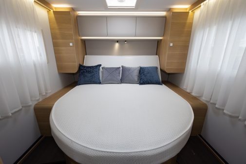 Ce lit central affiche des dimensions de 150 x 190 cm avec une tête relevable sur trois niveaux. Ce dispositif permet de dégager de l'espace en pied et d'élargir le passage d'une dizaine de centimètre. Côté sanitaire, ce profilé opte pour une douche indépendante du cabinet de toilette avec une gestion des espaces plutôt bien maîtrisée.
