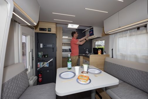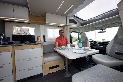 Le salon se compose donc de deux banquettes en vis-à-vis convertibles en places homologuées avec ceintures. En revanche, si celle côté conducteur profite d'un positionnement dans le sens de la marche, l'autre fait voyager le passager dos à la route. Le coin repas est surmonté d'origine d'un lit de pavillon électrique. Patience en revanche dans son utilisation tant à la remontée qu'à la descente. Le couchage principal, quant à lui, se situe en partie arrière dans une chambre élégante.