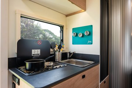 Ce profilé ultra-compact reçoit une implantation des années 2000, optimisée par les tendances. En effet, on trouve à bord un maxi-salon, une cuisine en L et un lit à la française, de 130 x 200 cm, jouxtant la salle d’eau en long. Dans ce poste sanitaire, Joa Camp a réussi à créer un volume modulable grâce à une paroi pivotante qui permet de convertir le cabinet de toilette en une vaste douche indépendante. Astucieux et vraiment fonctionnel !
