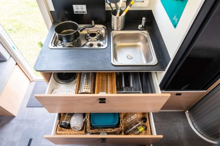 Le bloc principal de la cuisine reçoit plusieurs rangements. Il est muni d’un réchaud 2 feux et d’un évier en Inox. Il se prolonge par une colonne qui intègre le réfrigérateur de 133 l.