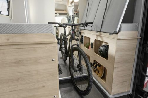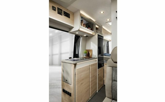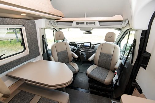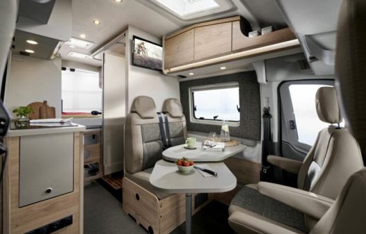Parmi les autres atouts de cette nouveauté, figure un double-plancher avec compartiment de rangement et sans marche. Il permet d'offrir une hauteur constante de 1,94 m dans tout le véhicule. Le coin cuisine s'équipe de placards de pavillon et de façades de tiroirs sans poignée, à bord biseauté, d'un grand plan de travail et d'un réfrigérateur à compression (84 l) en position haute. L'ambiance intérieure Camino se marie assez bien avec le mobilier Noyer Nagano.