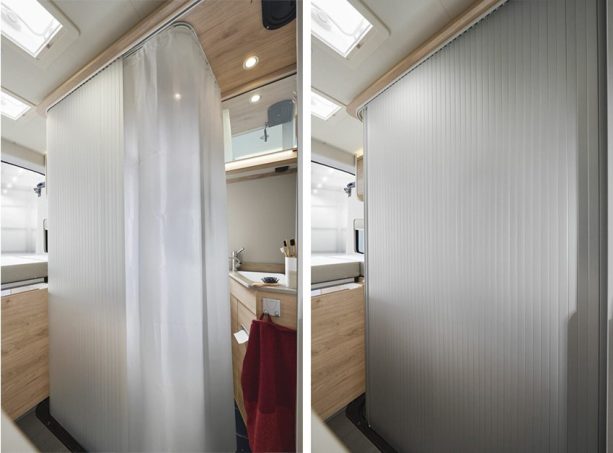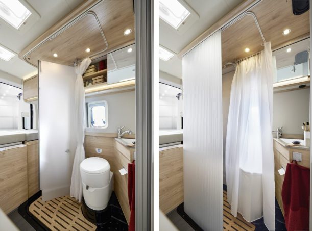 Celui-ci peut être réduit momentanément à une place quand on souhaite profiter d'une salle d'eau plus généreuse. Les ingénieurs Dethleffs ont donc imaginé de pouvoir le rallonger pour disposer d'une cabine de vraie douche. Dans la journée, lit en place, seuls WC et lavabo sont accessibles. En relevant une partie du sommier arrière gauche, puis en faisant coulisser une porte rideau servant de parois de protection, le cabinet de toilette double sa surface. Un rideau en Nylon clôt l'espace afin d'éviter les éclaboussures. Astucieux, même si l'installation demande un peu d'adresse.