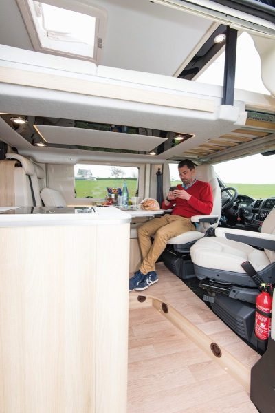 Nous retrouvons alors l’implantation des “simples” fourgons à lits superposés avec ses avantages et toujours l’inconvénient d’une intimité relative. On trouve cette formule en option sur le Dreamer D60 (55 500 €), sur l’ensemble de la gamme Knaus Boxlife à lit de pavillon sur soute, manuel (de 52 655 à 59 925 €), chez Pössl sur les Roadcruiser Evolution (dès 56 399 €) et Revolution (dès 58 099 €) ainsi que sur le V633M de Pilote/Bavaria (60 900 €), un véhicule intéressant car il est le seul fourgon à lit de pavillon sur soute sur Ducato H3 de 2,80 m de hauteur.