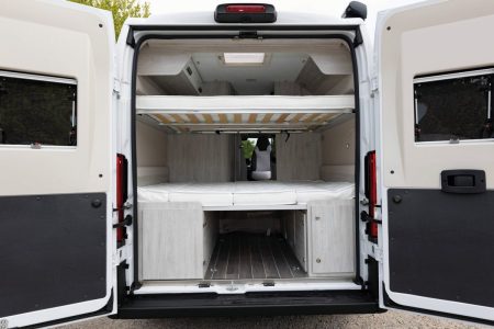 sont plus importantes afin de préserver des tirants d’air suffisants, en haut et en bas : abaissement du couchage bas, rangements hauts généralement réduits, avec la disparition d’un élément ou la réduction de leur taille. Et dans le cas de véhicules avec une penderie d’origine, cette dernière disparaît purement et simplement. Si le surcoût reste limité par rapport au modèle équivalent à lit transversal unique (environ 1 000 €), cette solution offre peu d’intimité entre parents et enfants.