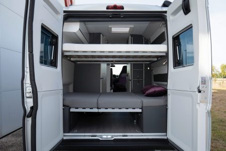 Apparue en 2017, l’implantation à lits superposés arrière dans un fourgon de 6 m est devenue aujourd’hui monnaie courante. Presque tous les constructeurs proposent cette disposition pour son double avantage de la simplicité et de l’économie, son développement restant relativement aisé : le lit transversal arrière est doublé d’un deuxième couchage au-dessus, modulable (pour un ou deux) et amovible. Généralement, les marques proposent cet aménagement sur une base connue et éprouvée, typiquement un véhicule de 6 m de long à l’implantation classique : dînette avec banquette face route, meuble de cuisine à l’entrée et salle d’eau tout-en-un. C'est dans la chambre que les modifications