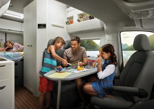 La très grande majorité des vans à toit relevable offrent au minimum quatre places carte grises (voire plus dans le cas de monospaces de loisirs à l’aspect “camping” moins prononcé) et autant de couchages, grâce au lit pour deux sous toit relevable et à la banquette convertible en couchage. Il est donc clairement possible de partir en couple avec deux enfants. Mais si leur taille réduite leur permet de se faufiler partout et de passer sous la plupart des barres de hauteur, généralement fixées à 2 m (attention toutefois, certaines municipalités ont tendance à les baisser de quelques dizaines de centimètres), elle a pour corollaire un espace de vie réduit et, bien souvent, l’absence de salle d’eau. Pas de souci s’il s’agit de partir pour un week-end même prolongé, mais une escapade plus longue imposera de faire étape dans des campings.