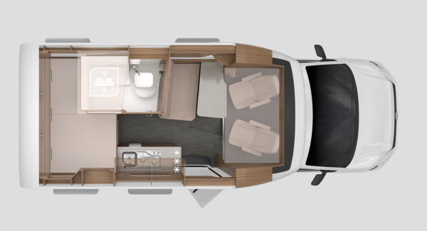 Ces deux implantations disposeront d’une cuisine spacieuse équipée d’un évier, d’un réchaud double feux, d’un réfrigérateur à compression Thetford (90 l). Cet équipement sera complété par un chauffage et un chauffe-eau alimentés par le carburant du porteur. Une mini-bonbonne de gaz (5 kg) assurera une réserve suffisante pour cuisiner. Pour voyager et dormir à quatre à bord, Knaus a prévu la possibilité d'installer un couchage coulissant au-dessus de la cabine, en option.