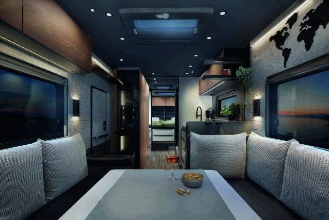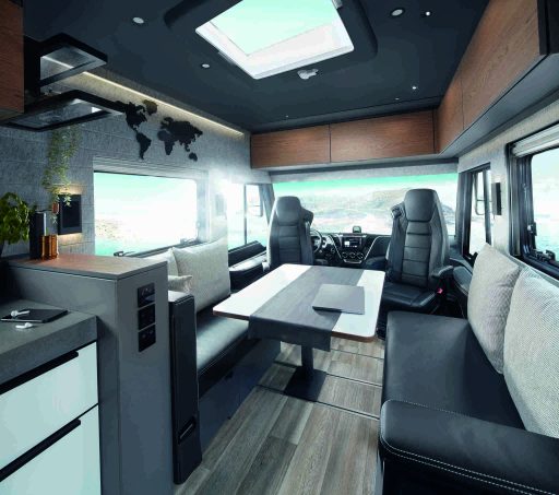 Comme dans l’iSmove, les parois de la cellule ont été revêtues de feutre générant un agréable environnement et une acoustique forcément feutrée. L’éclairage intérieur est intuitif et des capteurs de mouvement activent et désactivent l’éclairage nocturne tamisé. La banquette du salon se transforme rapidement en places face route grâce à un mécanisme de rotation développé par Niesmann+Bischoff.