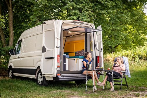 Spécialiste outre-Rhin dans l'aménagement de vans et de fourgons destinés aux loisirs, l'entreprise berlinoise PlugVan a développé une extension capable de doubler l'espace intérieur en quelques manipulations. Elle se présente sous la forme d'un caisson de 2,09 m de long, 1,28 m de large et 1,70 m de haut (dimensions adaptables en fonction du véhicule choisi). Emboîté par l'arrière dans le fourgon, quand ce dernier circule, il est ainsi possible de profiter des deux banquettes placées en face à face et séparées par une table centrale. A l'étape, ce module s'extrait facilement à la main grâce à un astucieux système de rails fixés au plancher et ne nécessitant pas plus de transformations. Sa mise en place ne prend que cinq minutes, le temps de l'extraire puis de déplier les deux pieds de soutien (avec une manivelle). L'opération peut être effectuée par une seule personne.