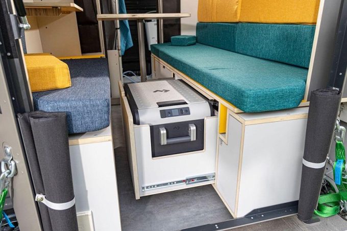 Pour la conservation d'aliments ou de boissons, il est possible d'ajouter, en option, une glacière électrique Dometic de 32 l. Une salle d’eau, comprenant cabine de douche et WC, reste aussi envisageable. Comptez 2 990 €, sans boiler à eau chaude. Ce dernier, alimenté au gaz, exige 1 000 € de plus mais améliore grandement le confort.