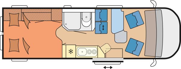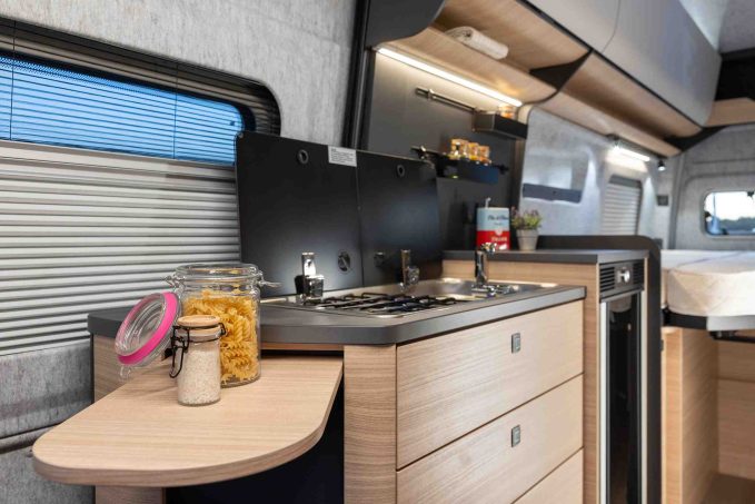 Le cabinet de toilette compact avec douche et WC intégrés garantissent le confort. Le bloc cuisine est équipé d'un réfrigérateur à compression de 90 litres, d'un réchaud deux feux et d'un grand évier. Une tablette rabattable augmente la surface du plan de travail.