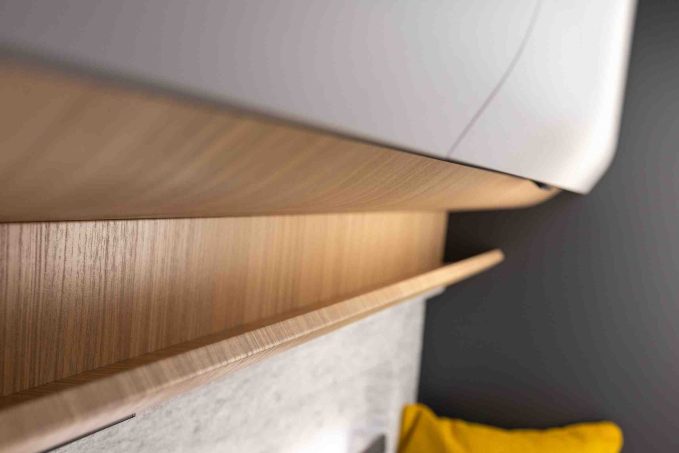 Ces propos se traduisent par un aménagement particulier réalisé à partir de mobilier en bois de noyer clair, d'éléments muraux gris graphite et de placards hauts blancs. L'ensemble crée un intérieur élégant et ouvert qui fait penser au design scandinave.