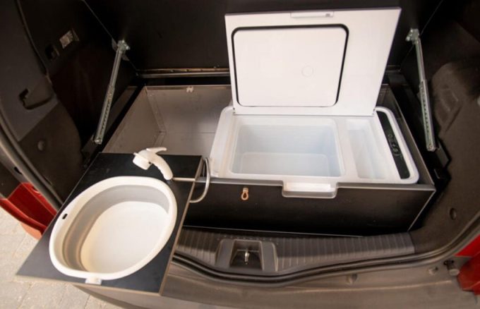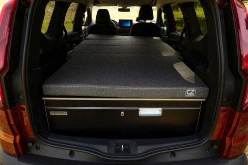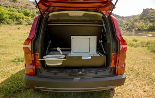 Ce kit permet de partir à l’aventure à condition de faire une croix sur sa configuration maximale à sept places. Son vaste coffre est en effet utilisé pour y installer un module de camping comprenant un coffre de 60 l, une réserve d'eau propre de 12 l (avec pompe et évier), une batterie auxiliaire, une glacière électrique de 15 l et un réchaud à gaz.