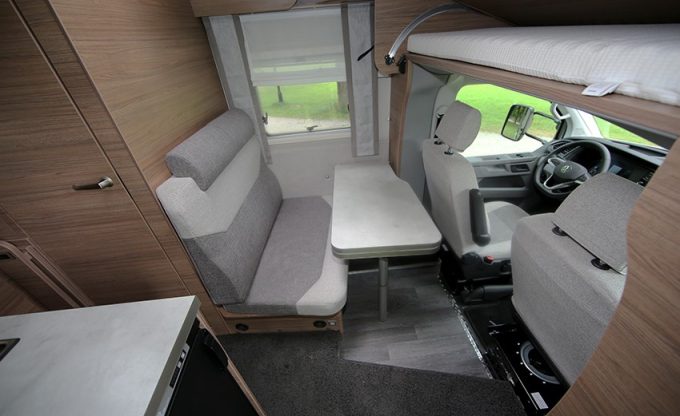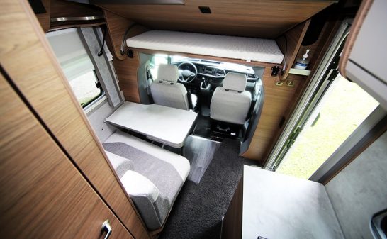Le Tourer VAN 500 LT comporte pour sa part une soute spacieuse et un grand compartiment de rangement au sol. La salle d'eau à paroi pivotante utilise l’espace de manière optimale en réunissant deux zones d’utilisation différente avec d’un côté, le lavabo qui peut être basculé d’un seul geste au-dessus du WC, et de l'autre former un espace douche fermé sur lui-même. Les tablettes de douche intégrées dans la paroi latérale sont utilisables dans les deux espaces. La vaste dînette, avec banquette en face à face, représente un autre point fort pour accueillir confortablement jusqu’à quatre convives (voire six avec les sièges cabine retournés).