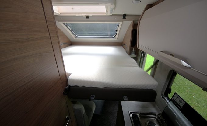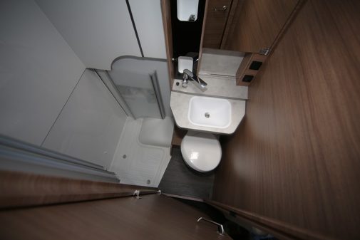 Le Tourer VAN 500 MQ possède une autre particularité. En quelques gestes, assistés d’un mécanisme innovant, le cabinet de toilette peut être adapté à différentes situations. Lorsqu’il n’est pas utilisé, la douche réglable en hauteur peut être abaissée. Une partie du matelas repose alors sur le dessus de la douche. Lorsque la douche est relevée, elle devient une cabine à part entière avec une paroi rétractable (hauteur sous plafond de 1,90 m). Que l’espace soit configuré pour la nuit ou pour la douche, les WC restent accessibles en permanence. Cette version se distingue aussi par son grand garage arrière et ses deux zones de couchage séparées (lit biplace à l’arrière et un autre coulissant à l’avant).