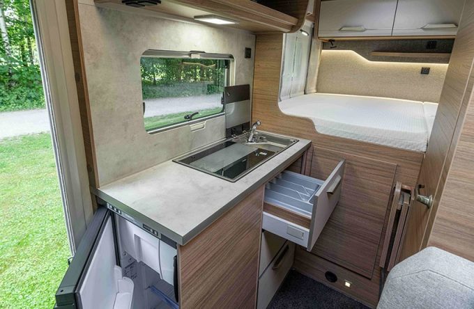Le nouveau profilé Knaus Tourer VAN Vansation se démarque avant tout par son châssis cabine d'origine, le Volkswagen sur Transporter 6.1. Ce modèle affiche une longueur de seulement 5,88 m pour une hauteur de 2,76 m avec une largeur intérieure de 2 m. A la fois spacieux et maniable, il sera décliné à son lancement avec deux implantations différentes dénommées 500 MQ et 500 LT. Toutes disposent d’une cuisine spacieuse équipée d’un évier, d’un réchaud à deux feux, d'un réfrigérateur à compression de 90 l (une bonbonne de gaz de 5 kg assure une réserve pour cuisiner). Un combiné sur carburant assure les fonctions chauffage et chauffe-eau. Placé au-dessus de la cabine, un lit coulissant (en option) pratique et ingénieux permet d’obtenir jusqu’à quatre couchages.