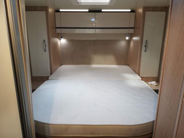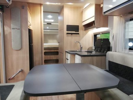 A bord, ce profilé mise sur une implantation très tendance sur le marché français. En effet, on retrouve un grand lit central de 142 x 195 cm. La chambre s'accompagne d'un poste sanitaire en deux parties avec douche indépendante et cabinet de toilette... le tout pouvant néanmoins être réuni dans un vaste espace transversal. Ce Siena 397 profite en partie avant d'un salon "lounge" avec des banquettes face-face. Agrémenté des sièges pivotants de la cabine, ce coin repas peut convenir pour quatre personnes. A noter qu'un lit de pavillon (130 x 192 cm) peut venir s'ajouter en option. L'ambiance se veut simple, mais plutôt flatteuse.