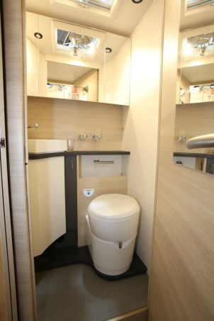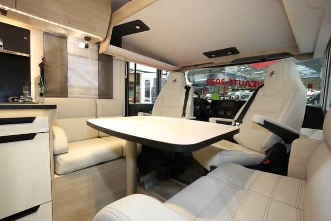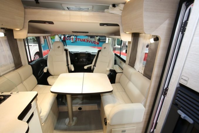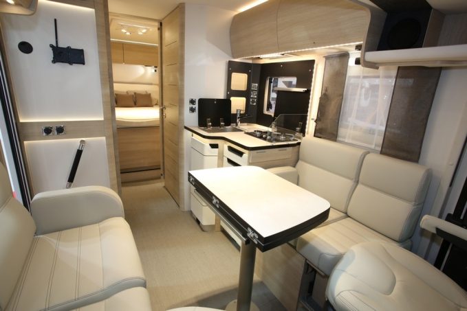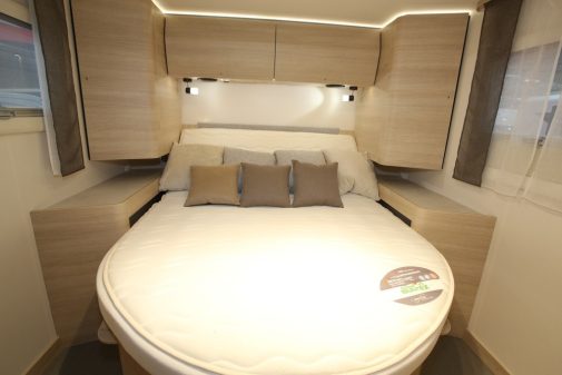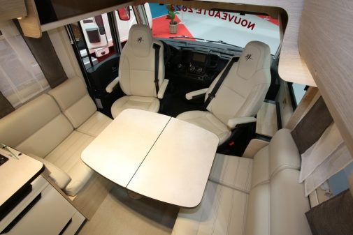 A bord, ce véhicule Rapido mise sur un lit central en chambre arrière, un couchage de 140 x 196 cm. La tête de lit est relevable, pouvant libérer de l'espace en pied. Il est aussi réglable en hauteur pour favoriser le volume en soute. La salle d'eau dévoile deux espaces indépendants : d'un côté, un cabinet de toilette et, de l'autre, une douche totalement isolée. Ces deux zones distinctes peuvent néanmoins se réunir pour occuper toute la largeur du véhicule. En partie avant, le salon adopte des banquettes face-face. A noter que le lit de cabine, une fois baissé, n'obstrue que partiellement le coin repas, laissant libre les assises en vis-à-vis. Fidèle à l'esprit Rapido, la cuisine bénéficie d'un mobilier en L avec un réchaud deux feux et d'un frigo de 149 l de série. Rapido conserve le très pratique verrouillage centralisé des tiroirs.