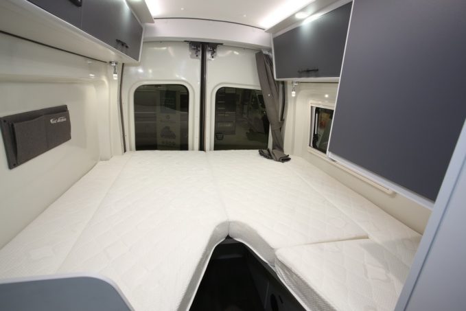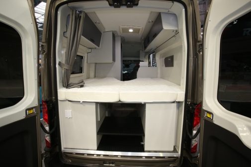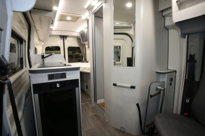 En partie arrière, la chambre accueille de vastes lits indépendants pouvant se relever afin de favoriser le volume en soute. Le Fortyvan 4x4 Duo profite de l'absence de banquette salon pour loger la salle d'eau derrière le siège conducteur. Dans cet espace sanitaire, Font Vendôme reprend le système TB Concept qui consiste ni plus ni moins en un lavabo rétractable et en une douche isolée par des portes à battant. L'ensemble est accessible via un rideau à lamelle coulissant. On retrouve la cuisine en toute logique au niveau de l'entrée. Le meuble reçoit un combiné évier/réchaud 2 feux, des rangements ainsi qu'un frigo en façade. Outre une capacité de 70 l, ce dernier profite d'une double ouverture. Ce véhicule est commercialisé à partir de 65 290 € avec la motorisation 2,0 l de 130 ch et ne l'oublions pas, la transmission intégrale standard.