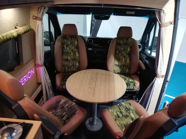 Outre le toit avec couchage double, l'intérieur se distingue très nettement de la concurrence avec un plan original misant sur l'espace, la circulation sans perdre évidemment l'aspect fonctionnel. Loïc Gaden, à l'initiative de ce projet, a en effet souhaité intégrer en partie avant un salon pour 4 personnes, mais... pas comme les autres. Ici, point de banquette. Chaque occupant profite en effet de son propre siège enveloppant, type automobile. Une idée inspirée des fourgons américains. A noter que les assises passagers sont sur rails et peuvent, par conséquen,t coulisser voire s'enlever.