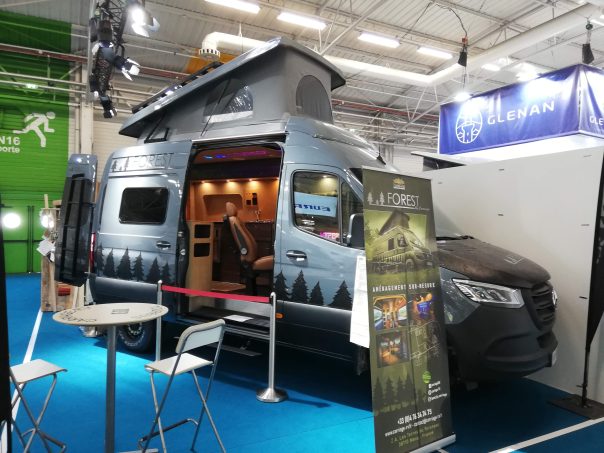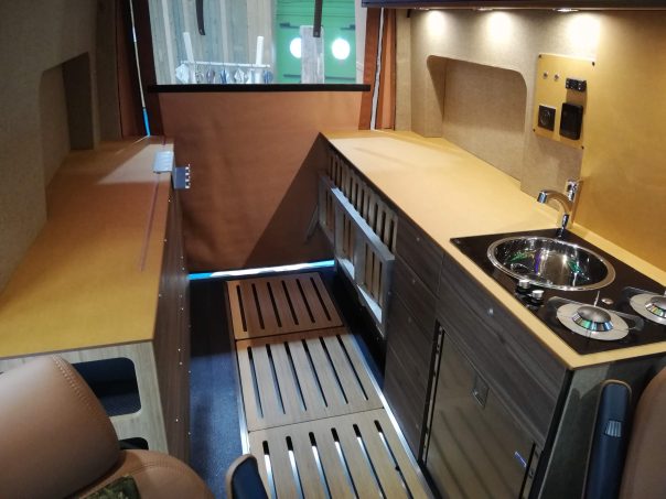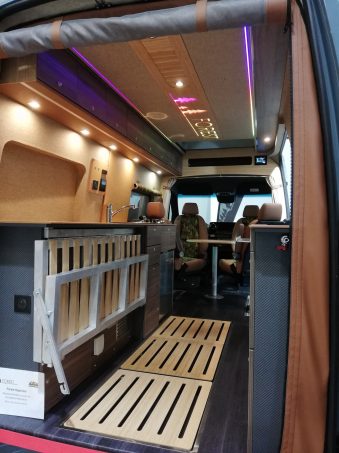 Sur le flanc gauche du véhicule, le long meuble fait de prime abord office de cuisine. On retrouve logiquement un réchaud deux feux, un frigo "tiroir" à compression ainsi que des rangements. Sans parler évidemment du vaste plan de travail qui se dessine. Ce dernier sert aussi pour le lit en venant en complément du sommier rétractable (dont l'articulation pour sa mise en place va être améliorée). En effet, dans le cas d'un usage à quatre, cet Hyperion profite d'un couchage transversal arrière, complémentaire de celui en pavillon. Pour la partie sanitaire, il faut regarder dans le plancher. En effet, trois caillebotis indépendants y sont intégrés avec dessous, un vaste receveur alu. Agrémentée d'un rideau déperlant, la douche peut ainsi changer de position en fonction de l'utilisation et de l'encombrement à bord du fourgon. Encore à l'état de développement, cet Hyperion annonce tout de même la couleur tant intérieurement, qu'extérieurement grâce à son look baroudeur.