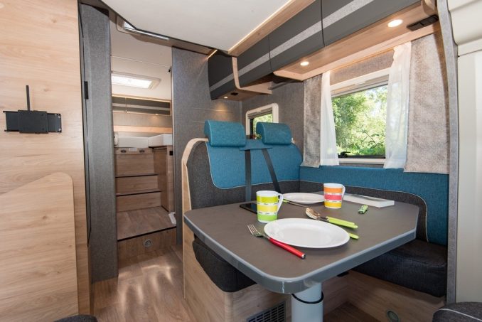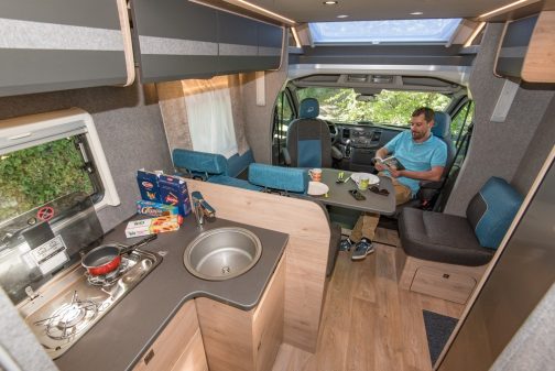 D’une manière générale, Dethleffs propose ce véhicule dans l’esprit « prêt à partir » avec un haut niveau d’équipement, dont la porte de cellule extra-large (65 cm) avec baie et moustiquaire intégrés. L’accès à bord est facilité par le marchepied électrique. On découvre alors le coin salon mis en valeur par la sellerie Salerno de belles teintes Gris et Bleu, exclusive à la collection JustGo. Sur notre modèle d’essai, la dînette comportait une banquette en L face route pour deux personnes, et d’un petit sofa latéral. Il faut évidemment ajouter les sièges pivotants de la cabine du porteur. Comme toujours avec le Ford Transit, la manipulation de ces sièges nécessite un peu de patience et d’astuce. Le plateau de table dont a ligne est moderne, repose sur un pied central télescopique. Ce dispositif facilite la conversion de la dînette en couchage d’appoint pour un convive.