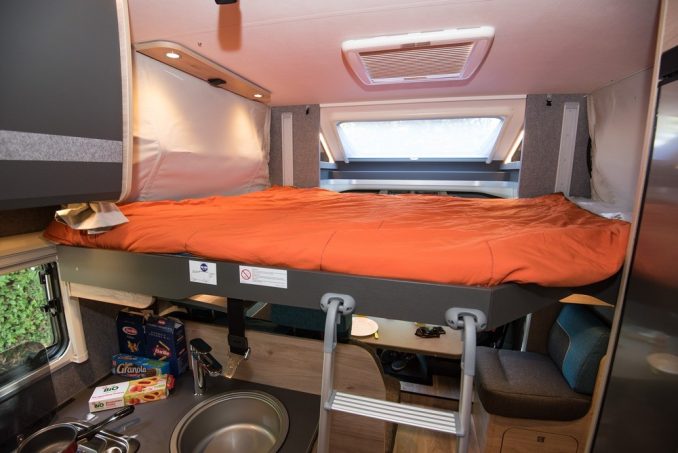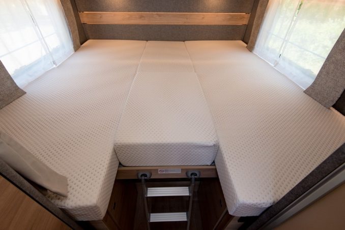 Notre profilé à l’essai était par ailleurs pourvu d’un lit de pavillon à commande électrique. Ce couchage est une option à 1 610 €. Celui-ci rogne la hauteur intérieure d’une vingtaine de centimètres (on passe de 2,13 m à 1,92 m) mais il permet de profiter d’un « vrai » couchage double avec un confort nettement supérieur à celui du lit de dînette.