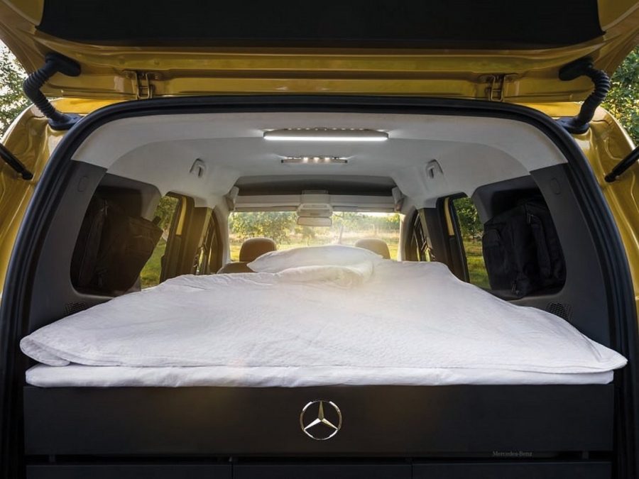 Long de 4,49 m, ce ludospace affiche de belles rondeurs au niveau de son capot avant. Le jaune Limonite métallisé participe à cette élégance. Pour ce véhicule, Mercedes annonce la possibilité d’y installer une “box” conçue par Brabus Automotive. Positionné dans le coffre, ce module propose un sommier articulé qui se déplie très rapidement pour former un couchage de 115 x 200 cm. Le kit compte également de multiples rangements et une cuisine constituée d’un réchaud, d’une glacière et d’un évier rétractable doté d’une réserve d’eau. Un set avec table et chaises est également disponible. Une embase située au niveau des places arrière permet de recevoir le plateau de table en cas de mauvais temps.