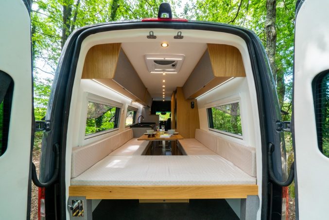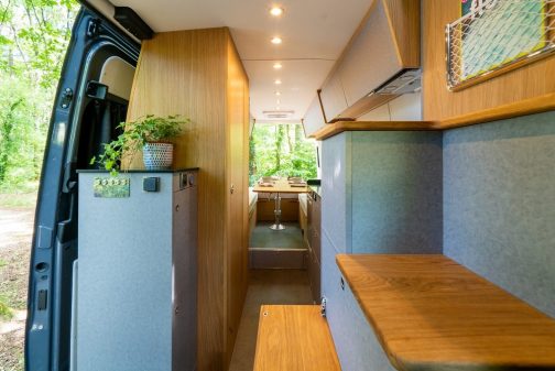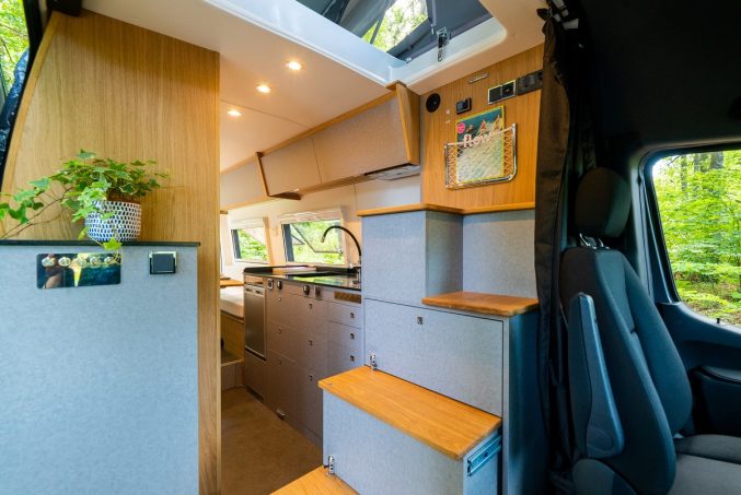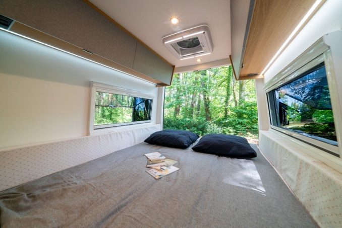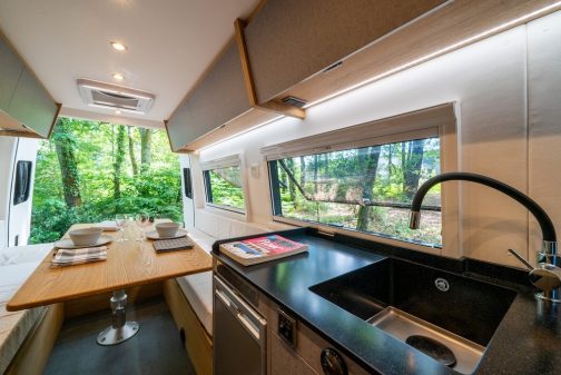 Ainsi en partie avant, un joli meuble de rangement se transforme en escalier pour pouvoir accéder au couchage dans le toit. Superbe ! En partie arrière, il loge un grand salon en U agrémenté d’un vaste plateau de table sur pied central. L’ensemble se convertit en couchage double. A bord, l’élégance est de mise avec des meubles en chêne, une cuisine en Corian, une cabine de douche aux parois recouvertes d’une feuille d’ardoise naturelle…