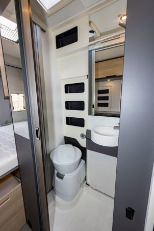 Le D55 Fun offre un espace plutôt large et permet d'accueillir ainsi jusqu'à 4 personnes. Le salon avec une banquette face route et les sièges avants pivotants créent un espace convivial autour de la table. Le coin cuisine, quant à lui, plutôt spacieux, se pare d'un évier en inox, réchaud deux feux, de nombreux rangements et un grand frigo de 84 L. Pour accéder à la salle d'eau, il faudra simplement ouvrir la porte coulissante. Disposant d'un paroi pivotante duo'space, la douche se dévoile facilement. Enfin, à l'arrière de la cellule, un grand lit transversal avec sommier relevable offre un couchage pour deux personnes. Deux autres convives peuvent passer la nuit à bord du véhicule, en partie avant, le salon pouvant se transformer en second couchage.