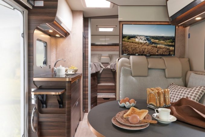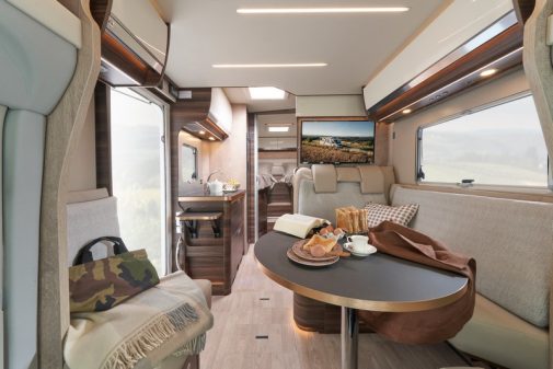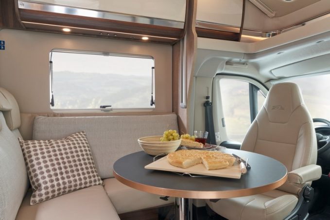 Enfin, pour les modèles à lits jumeaux, des rangements ultra profonds ont été ajoutés et le revêtement de la table, de la cuisine et du lavabo sont désormais en Fenix, un matériau très résistant aux rayures et à l’abrasion pour une plus grande durabilité. La table rectangulaire de la dînette, à quant à elle était remplacée par une table ronde sur pied télescopique. Pour les modèles Ecovip DS (dotés d'un salon face-face), une fixation Isofix est désormais disponible (en option), afin d'installer un siège auto dans l'espace dînette pour le confort de toute la famille.