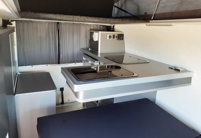 Intégré au groupe Narbonne Accessoires, Lando ne propose plus qu’une gamme sur Ford Transit Custom. Celle-ci est composée des modèles Sydney et Bondi. Mais d’ici quelques mois, le Peugeot Expert fera son retour au catalogue, peut être sous l’appellation Darwin (utilisée autrefois). Si la clientèle peut choisir son van avec un véhicule de différentes tailles (court ou long), tous embarquent un même mobilier avec structure en alu alvéolé (plus léger et résistant dans le temps). L’enseigne occitane se distingue aussi par le montage de deux types de toit relevable. De série, le véhicule a droit à un modèle de chez CPLV avec un couchage se passant de sommier. Contre un supplément, le toit de chez SCA intègre, lui, un sommier à coupelles apportant plus de confort. La série Sydney est identifiable à son mobilier en bois clair. Les autres modèles profitent du bois gris cérusé avec finition alu brossé, titanium ou blanche. La série Bondi met en avant l’élégance et la praticité au service du bien être (plan de travail avec un évier et réchaud très aériens, WC à cassette dans le coffre arrière).