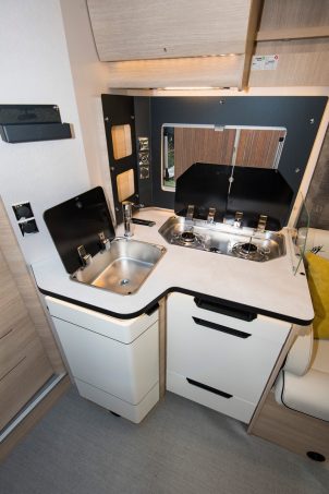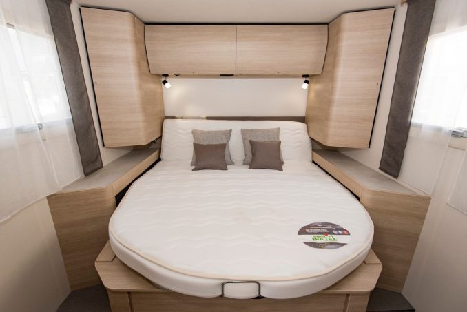 Pour faciliter les déplacements dans la chambre, Rapido a installé un sommier coulissant avec tête de lit relevable. Ce système permet de dégager une quinzaine de centimètres au pied du lit. Ce couchage permanent est également réglable en hauteur, à l’aide d’un moteur électrique. Ce dispositif – en option également – permet de moduler le volume de la soute.
