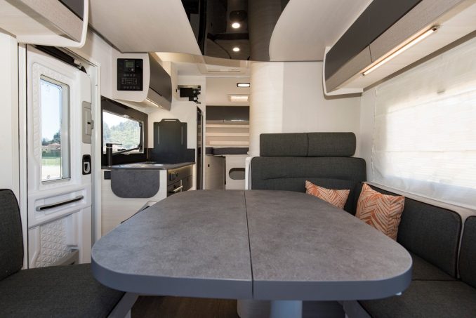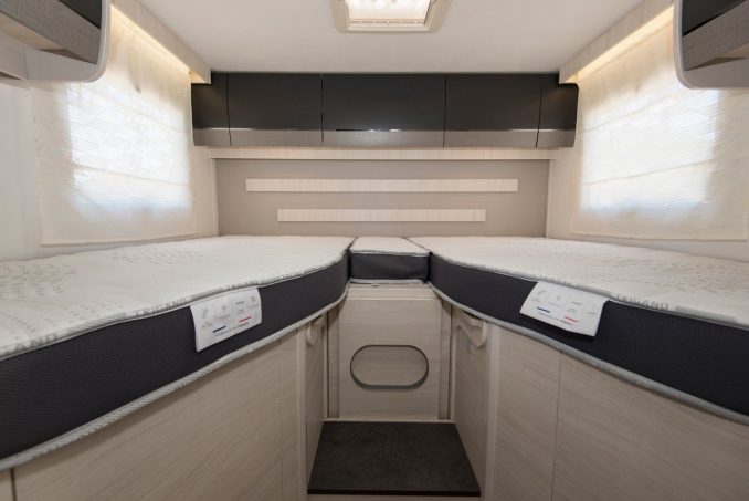 A bord du profilé 287 GA, nous trouvons un vaste salon avec banquette en L. En ôtant le coussin créant le retour, on transforme l’assise en deux places face route. La cinquième personne se retrouvera dos à la route. A l’étape, ce 287 GA est également conçu pour recevoir cinq personnes, pour les repas comme au moment du coucher. La table est bien dimensionnée. Elle est encadrée par la banquette en L, un sofa latéral et les sièges pivotants de la cabine. Cette dînette peut, en option (1 000 €), être surmontée d’un couchage de pavillon (140 x 190 cm). En partie arrière, nous trouvons de vastes lits jumeaux (90 x 200 cm). Dans la gamme Graphite Ultimate, la rallonge de matelas est de série. Elle permet de réunir les deux couchages pour en former un grand, version king size (130 x 205 cm). Trois enfants peuvent alors en profiter. Le reste de l’habitacle est occupé par la cuisine et le cabinet de toilette avec cloison pivotante.