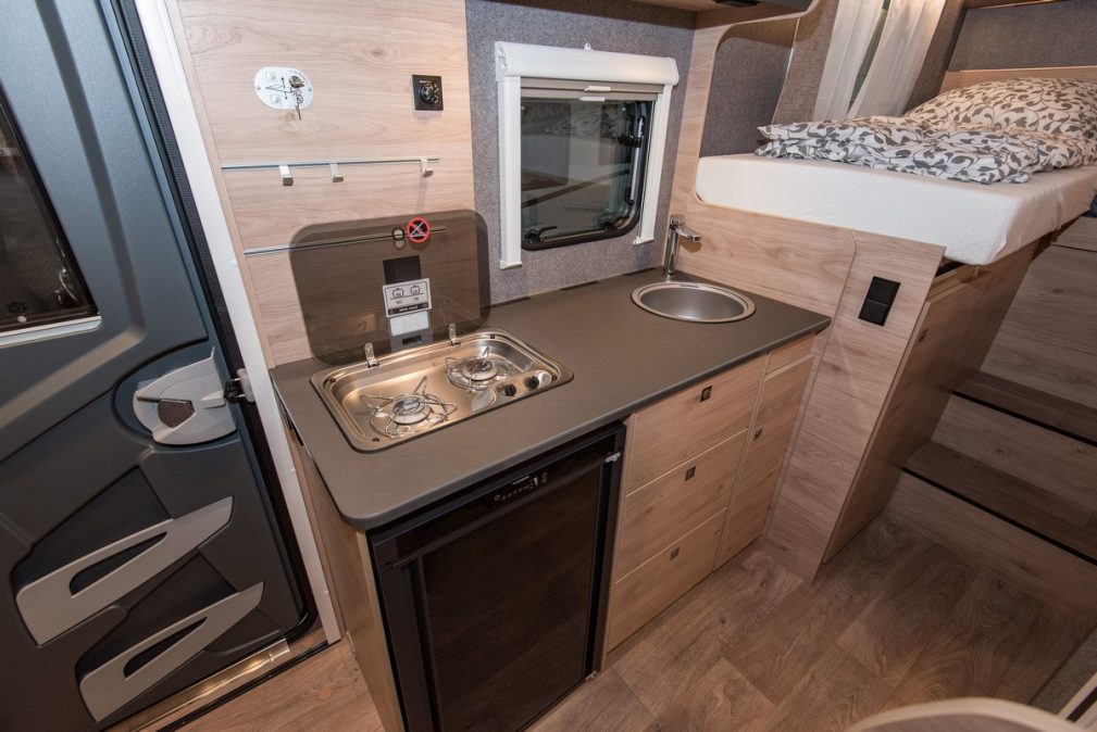 Le traitement est flatteur, et les placards de pavillon permettent d’entreposer de nombreuses affaires. Au pied des lits jumeaux, se trouvent la salle d’eau et le bloc-­cuisine. Celui-ci présente des dimensions généreuses, un vrai plan de travail entre l’évier et le réchaud 2 feux. En revanche, Dethleffs n’a pu installer qu’un petit frigo (83 l) en partie basse.