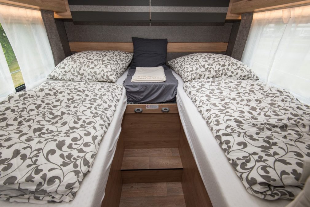 En montant à bord du T6615 EB, on découvre à l’arrière, des lits jumeaux de belles dimensions (80 x 200 cm chacun). La rallonge centrale, de série, autorise à créer un vaste couchage de 170 x 210 cm, que l’on rejoint par une échelle – sommier et matelas additionnel empêchant l’accès aux marches.