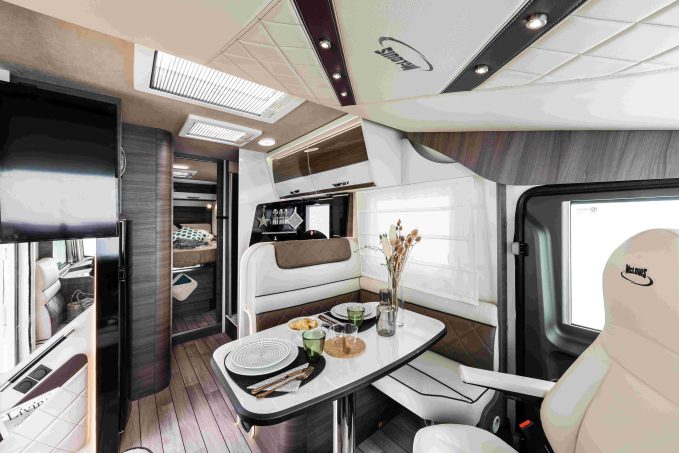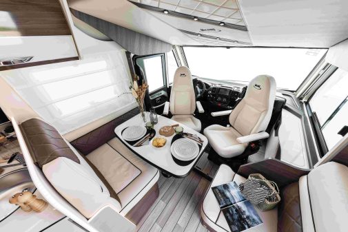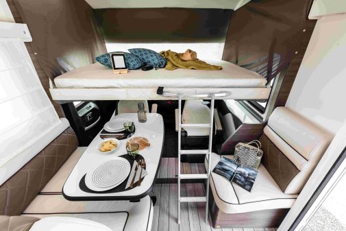 Au cœur de la série 800 qui représente ce qui se fait de mieux chez McLouis, figure l’intégral Nevis 879. Cette unité de 7,45 m de long se montre idéale pour un couple qui aime voyager loin dans un confort absolu. A bord, les occupants disposent d’un maxi salon cinq places où il fait bon partager des moments chaleureux en famille ou entre amis. Le lieu est lumineux, élégant, pratique. La déco est chaleureuse et les banquettes moelleuses. En bref tous les éléments sont réunis pour créer un environnement cocooning agréable à vivre.