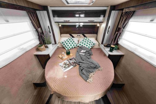 Venons enfin à la chambre. Positionnée logiquement en partie arrière, elle comporte un lit king size de 190 x 150 cm. Sa hauteur est réglable de manière à faire varier le volume de la soute garage que ce couchage surmonte. Le matelas, conçu dans une mousse haute densité, repose sur un sommier à lattes. Cette combinaison assurant un maximum de confort aux occupants.