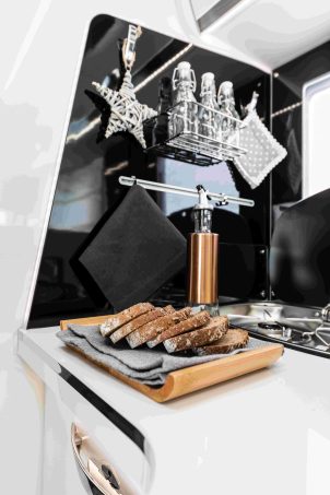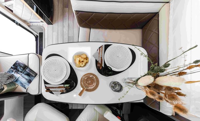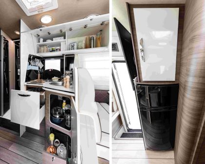 Les équipements dont profitent le Nevis 879 sont à la hauteur du haut niveau de standing attendu. Le bloc cuisine, par exemple, est parfaitement ergonomique et doté de nombreux rangements pour stocker les casseroles, les verres, les assiettes et les denrées alimentaires. Les aliments frais seront conservés au frais dans le grand réfrigérateur de 145 litres. Sa technologie trimixte à absorption lui permet de fonctionner sur trois types d’énergie : gaz ou électricité 12 où 220 V, le choix se faisant automatiquement, sans intervention humaine.