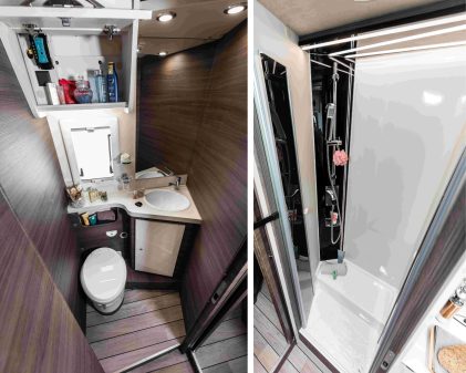 Évoquons justement la salle d’eau. Celle-ci est formée de deux compartiments indépendants. Sur la droite se trouve le cabinet de toilette, ample et bien ventilé, comprenant les WC à cassette et un joli meuble vasque. Sur la gauche, la cabine de douche, également grande et assez haute, de se laver confortablement. Comme sur la plupart des camping-cars modernes, les deux compartiments de la salle d’eau peuvent être réunis par un jeu de porte et de cloison pour former une vaste pièce d’eau transversal et constituer ainsi un vrai sas entre le salon et la chambre.