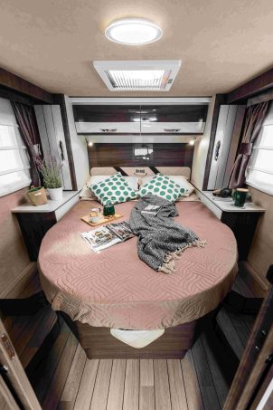 Un deuxième grand couchage est disponible à l’avant. Il s’agit du lit de cabine. Comme dans la grande majorité des intégraux, ce lit s’abaisse et se remonte aisément à l’aide d’un système de pantographe. Une fois abaissé, la banquette et la table restent exploitables. Les amateurs de petits déjeuner au lit apprécieront.