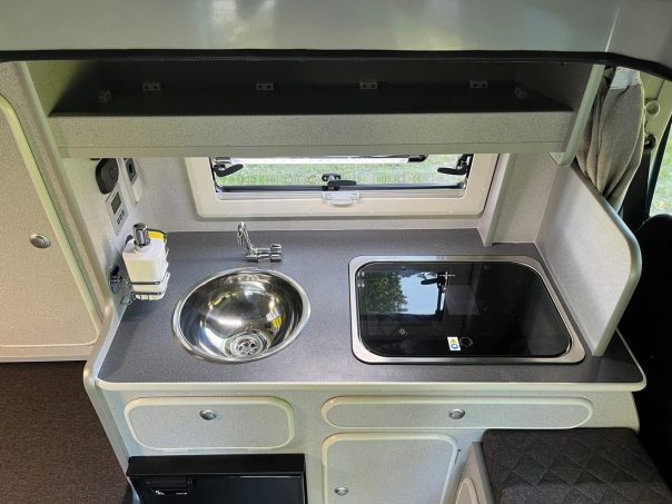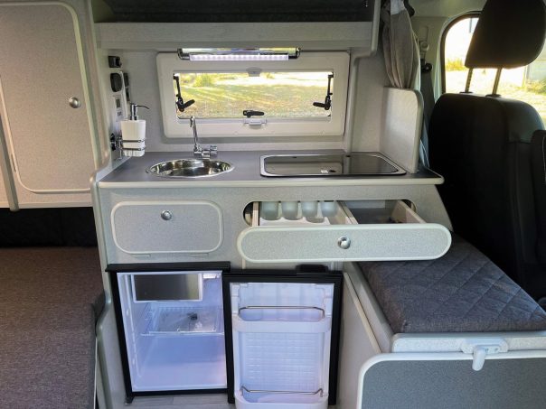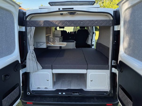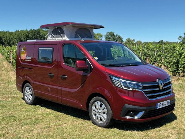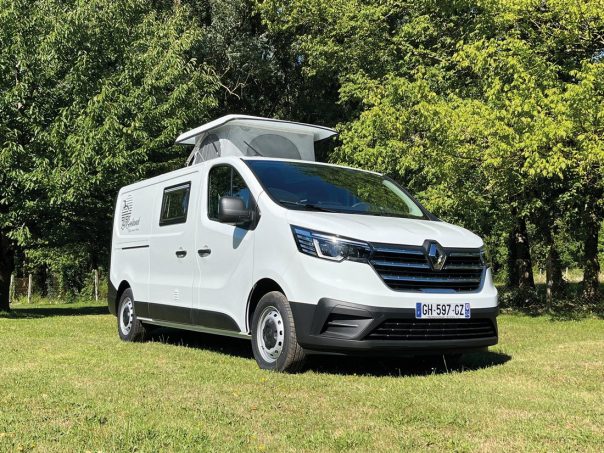 Comme dans un plus gros fourgon à lit transversal, la partie centrale est amovible afin d’autoriser le chargement de vélos, par exemple. En dînette, un coffre multifonction propose un espace de stockage (où peuvent prendre place les WC portables optionnels) ainsi qu’une assise. De nombreuses autres options permettent de personnaliser le Goëland : toit champignon, baies supplémentaires, panneau solaire, booster, table amovible, siège passager pivotant, store extérieur… Evasion 24 livre des véhicules à partir de 44 130 €. Mais l’aménageur œuvre également sur des bases fournies par les clients, à des prix très intéressants : dès 12 590 € sur Renault Trafic 2001-2014, dès 14 450 € pour un modèle postérieur. Il propose aussi un agencement pour la version longue du Trafic (5,48 m, 16 100 € pour l’aménagement seul). Le lit est alors disposé longitudinalement. Atteignant le 1,90 m, il convient mieux aux grands gabarits.