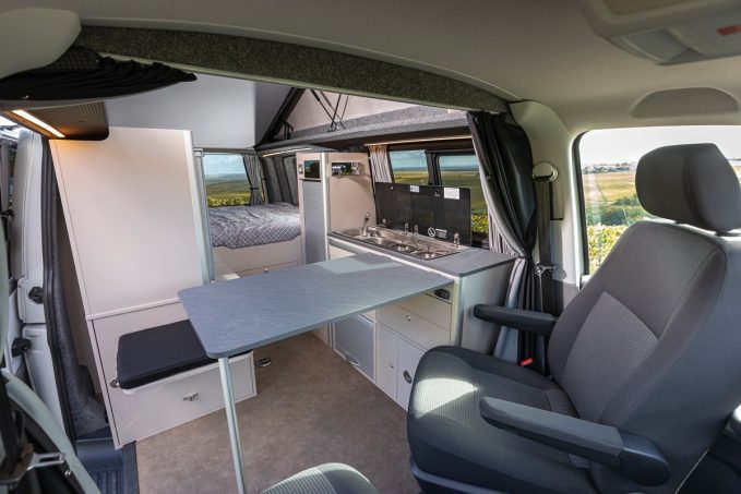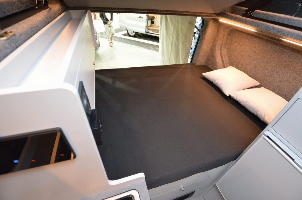 Grâce à des extensions de carrosserie, installée sur le haut des panneaux arrière, le couchage affiche des dimensions de 130 x 190 cm sur base Renault Trafic ou 120 x 182 cm sur Volkswagen T6.1.